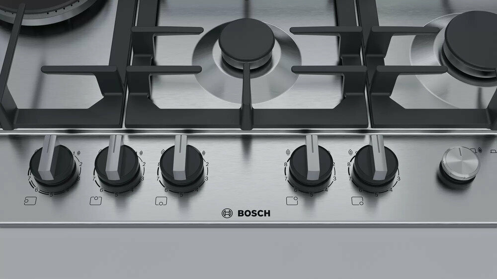 Варочная панель газовая Bosch PCS7A5M90, конфорок - 5 шт, электроподжиг, газ-контроль, серебристый