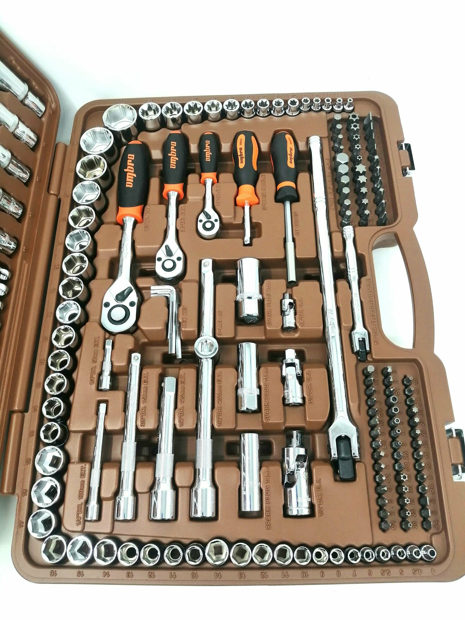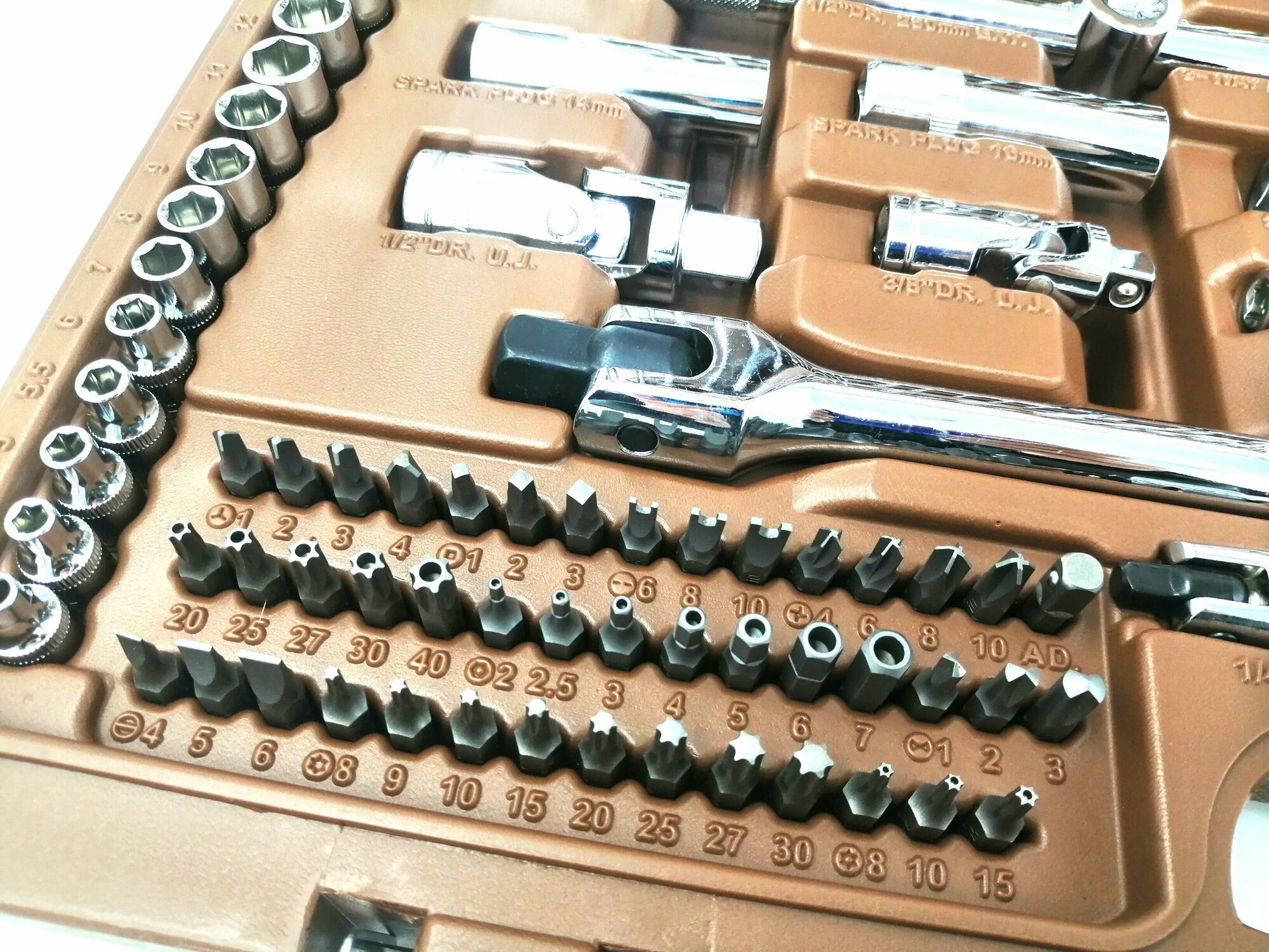 — Все инструменты в нижней половине набора (вороток, отвёртка, головки и пр.) не сидят плотно в своих посадочных местах. Если случайно уронить кейс - всё это богатство разлетится по разным углам |