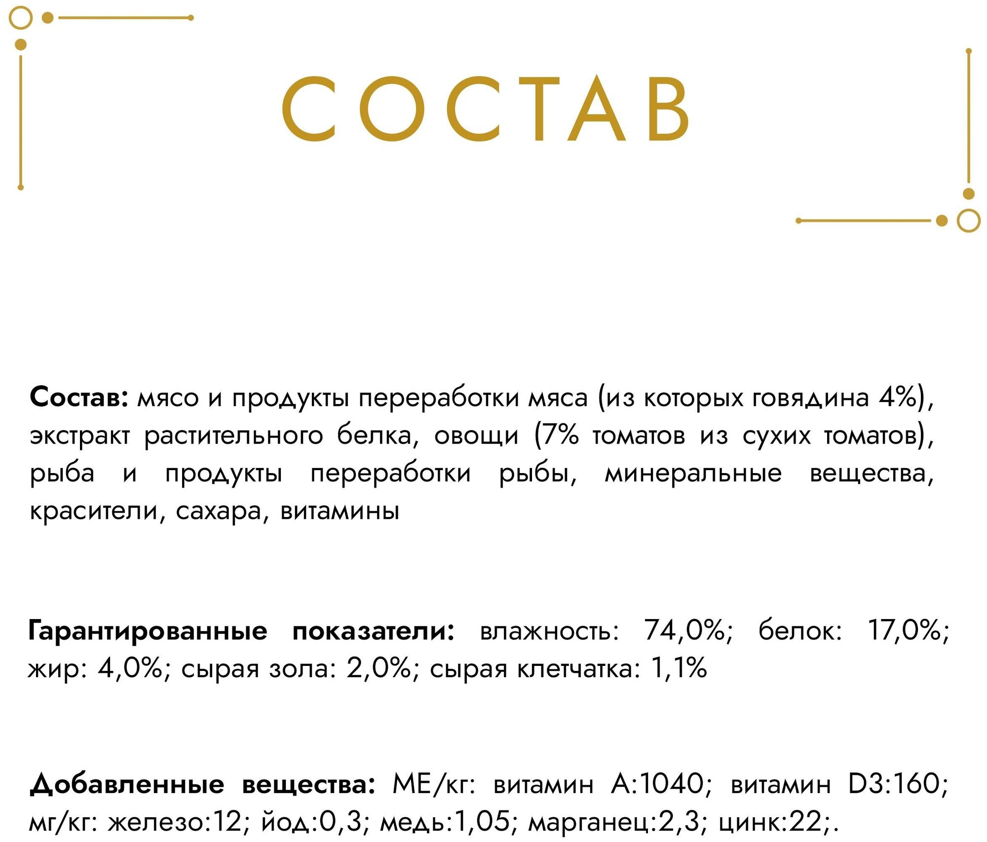 мясо и продукты переработки мяса (из которых говядина 4%), экстракт растительного белка, овощи (7% томатов из сухих томатов), рыба и продукты переработки рыбы, минеральные вещества, сахара, витамины