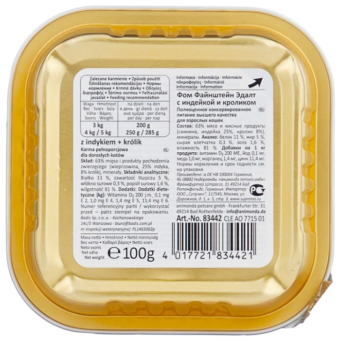 СохранитьКорм для кошек ANIMONDA Vom Feinsten Adult индейка, кролик конс. 100г (упаковка - 32 шт) интересное: