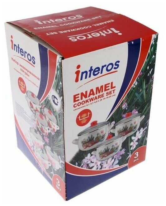 Набор эмалированных кастрюль Interos 2400 Розовые герберы 2,1 л 3,1 л 4 л с крышками