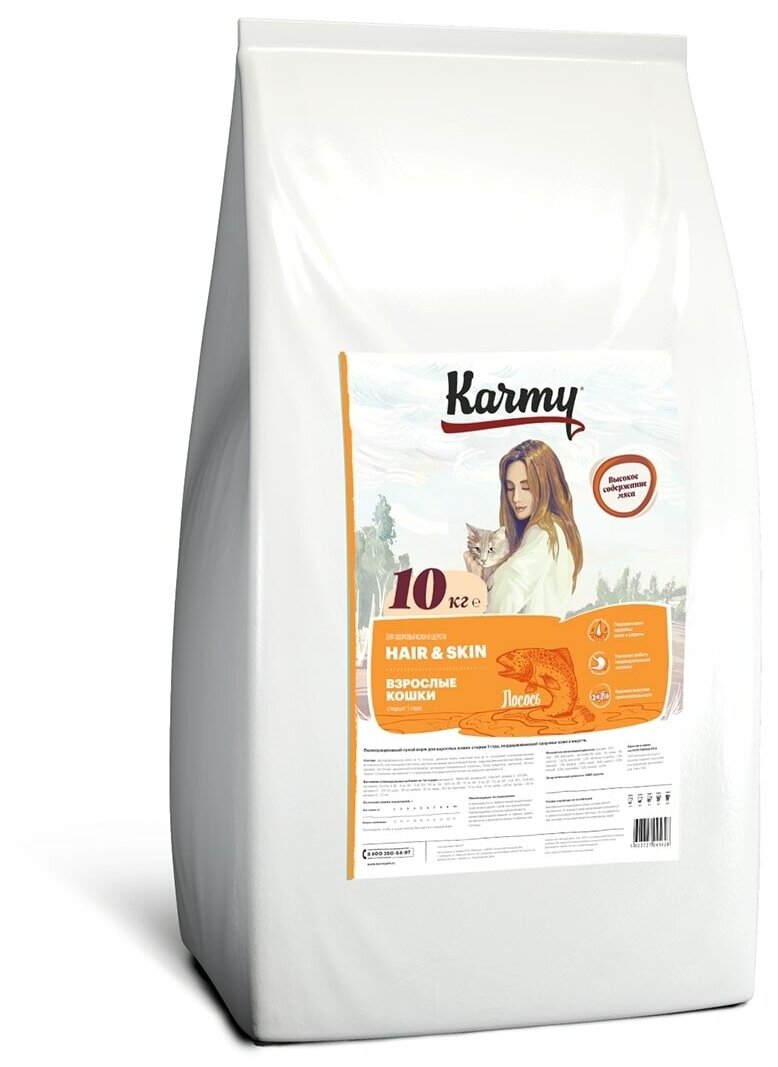 Купить Karmy корм для взрослых кошек, идеальная кожа и шерсть, лосось 10 кг