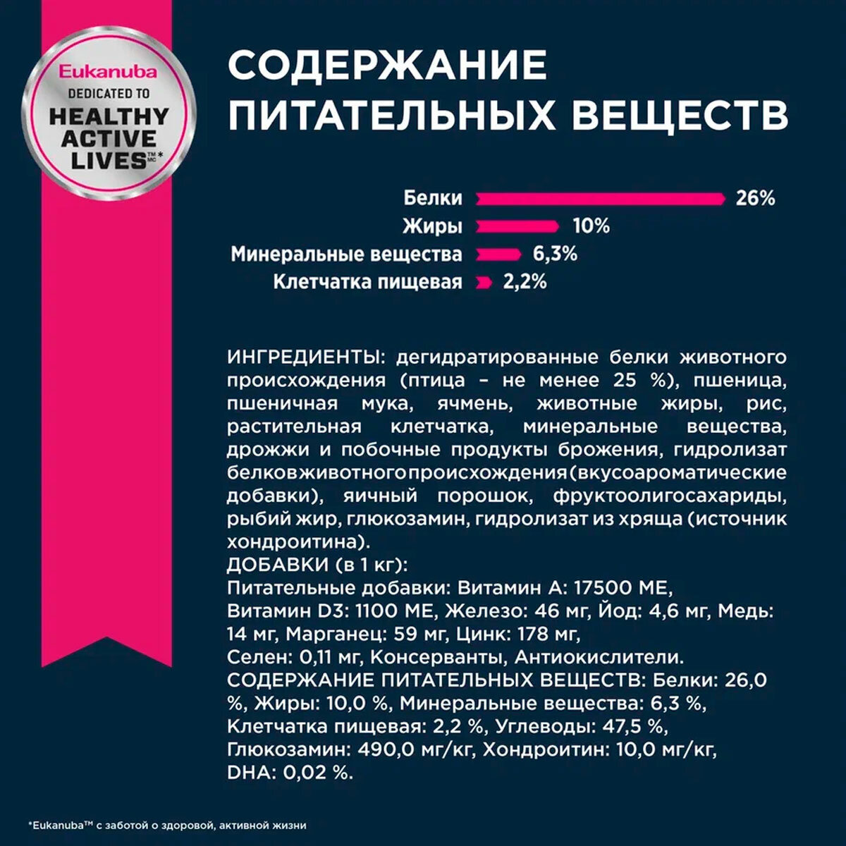| Состав | дегидратированные белки животного происхождения (домашняя птица) 26%, пшеница, ячмень, пшеничная мука, жир животный, рис, пульпа сахарной свеклы, минералы, сухое цельное яйцо, гидролизированный животный белок, высушенные пивные дрожжи, фрукто-олиго-сахариды, рыбий жир |