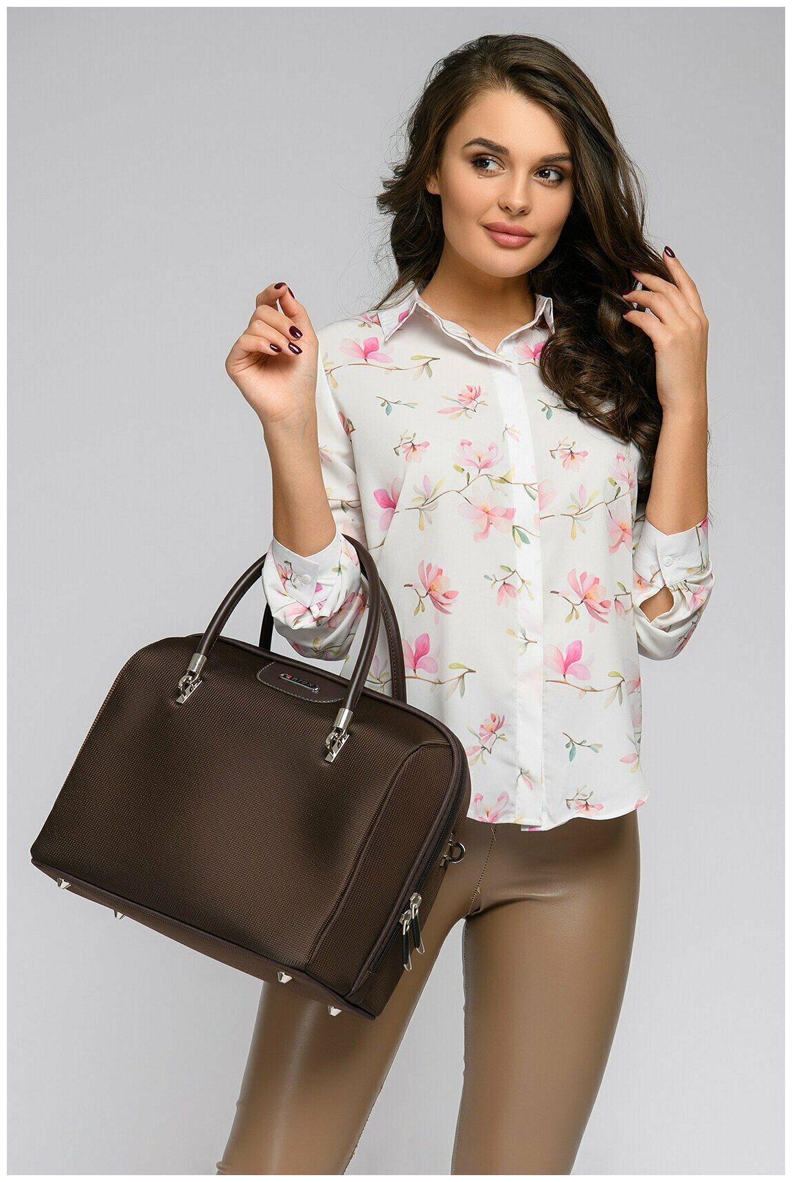Дорожная сумка с ремнем на ручку чемодана Рион+ (RION+) / ручная кладь для самолета / саквояж, R240, экокожа, 20 литров, серый-цветы