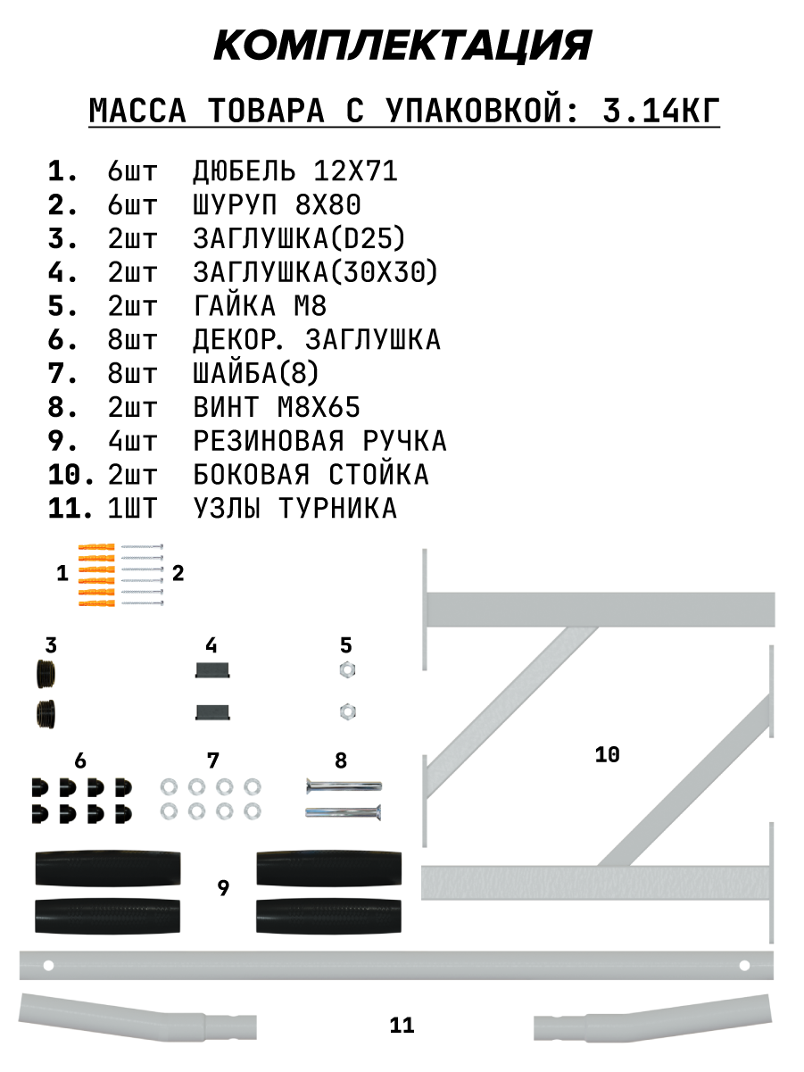 | Дополнительная информация | Комплектация: Узел турника-1шт; боковая стойка - 2шт, ручка турника - 4шт, заглушка круглая d25 - 2шт,; дюбель 12х71 - 6шт, шуруп 8х80 - 6шт, винт М8х65 - 2шт, шайба (8) - 8шт; гайка (8) - 2шт, колпачок декоративный - 8шт, заглушка 30х30 внутренняя - 2шт |