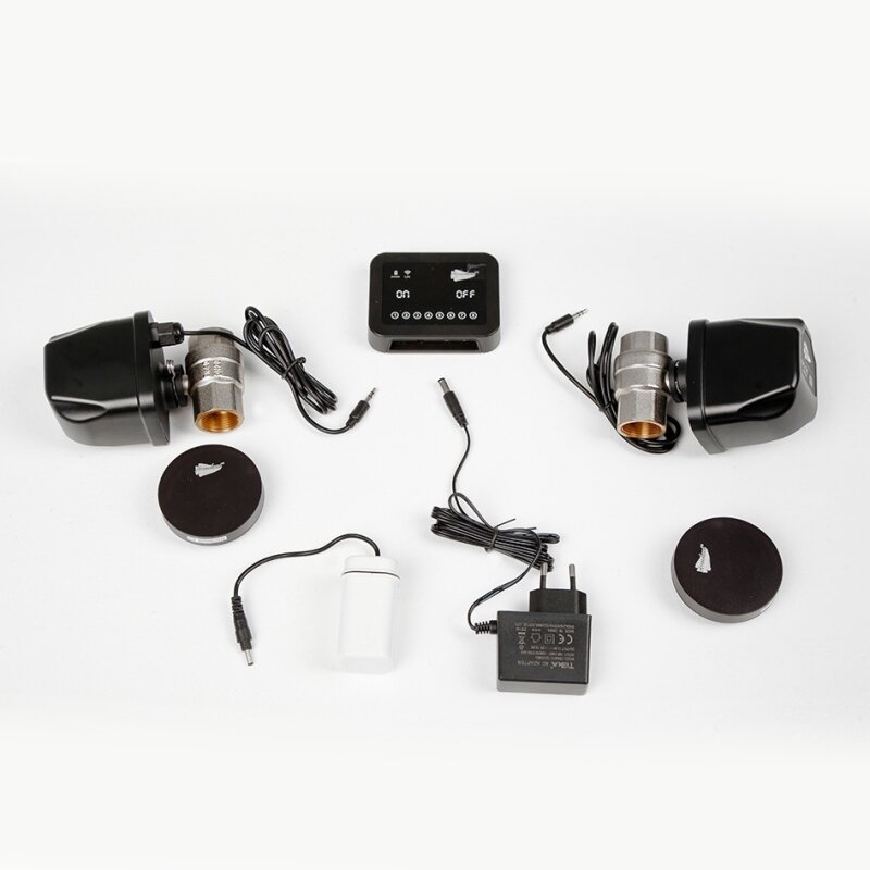 | Подробная комплектация | 2 шаровых крана на 1/2" с электроприводами, контроллер, 2 беспроводных датчика, кейс для резервного питания |
