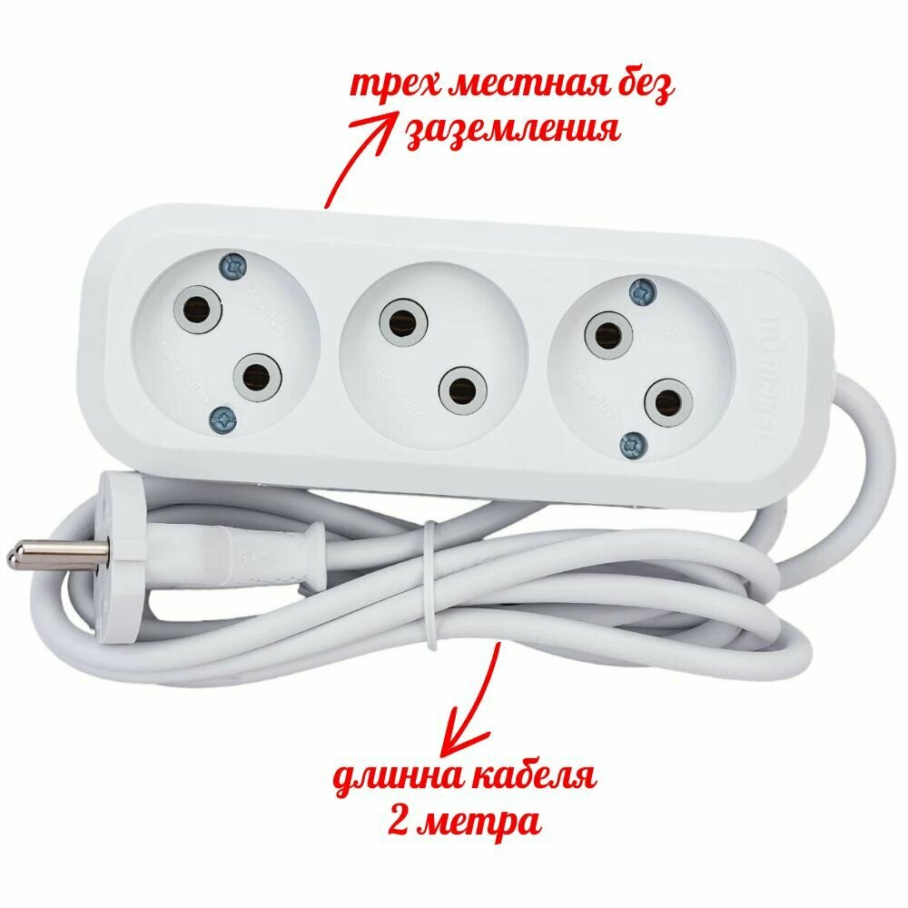 Удлинитель Makel 3 гнезда 2 м электрический без заземления ПВС 2200 вт 220в, MGP122