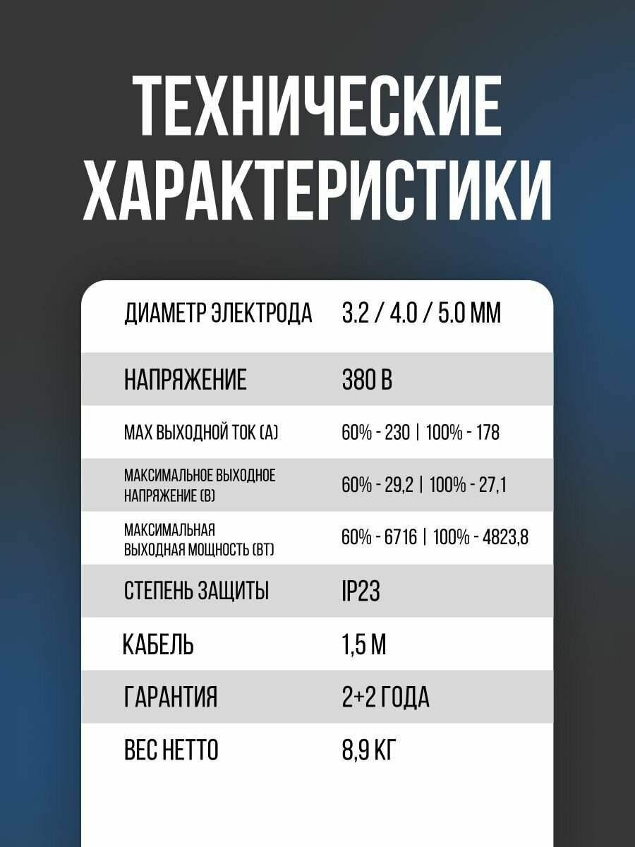 | Дополнительные функции | антиприлипание / горячий старт / форсаж дуги |