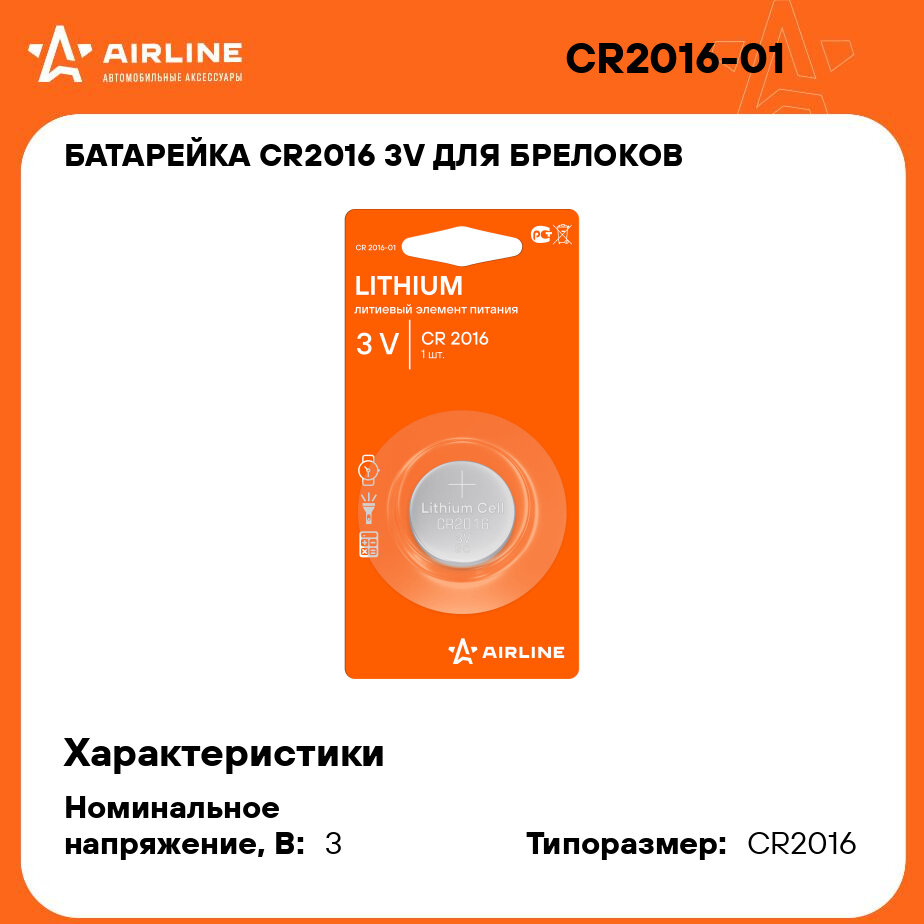 Батарейка CR2016 3V для брелоков сигнализаций литиевая 1 шт. CR2016-01 AIRLINE интересное: