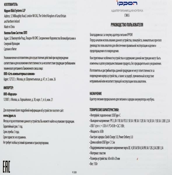 Адаптер питания Ippon CW65, 5 - 20 В, 3.25A, 65Вт, черный интересное:
