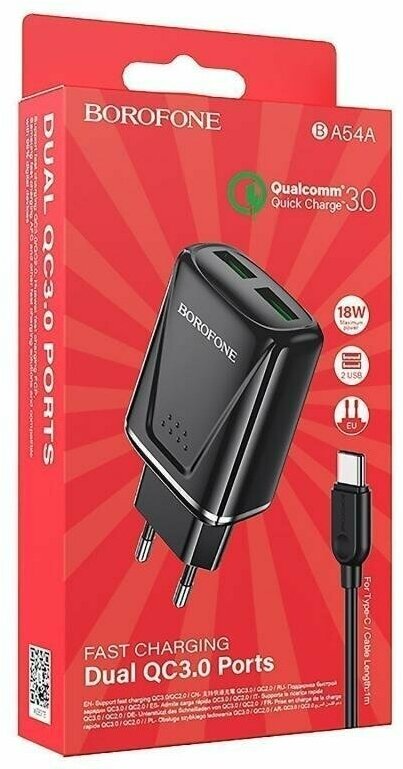 Сетевое зарядное устройство USB Borofone BA54A (2.4A/2 порта USB/QC3.0/кабель MicroUSB) <черный>
