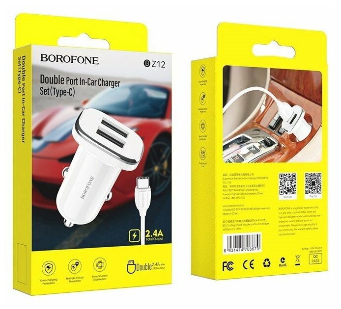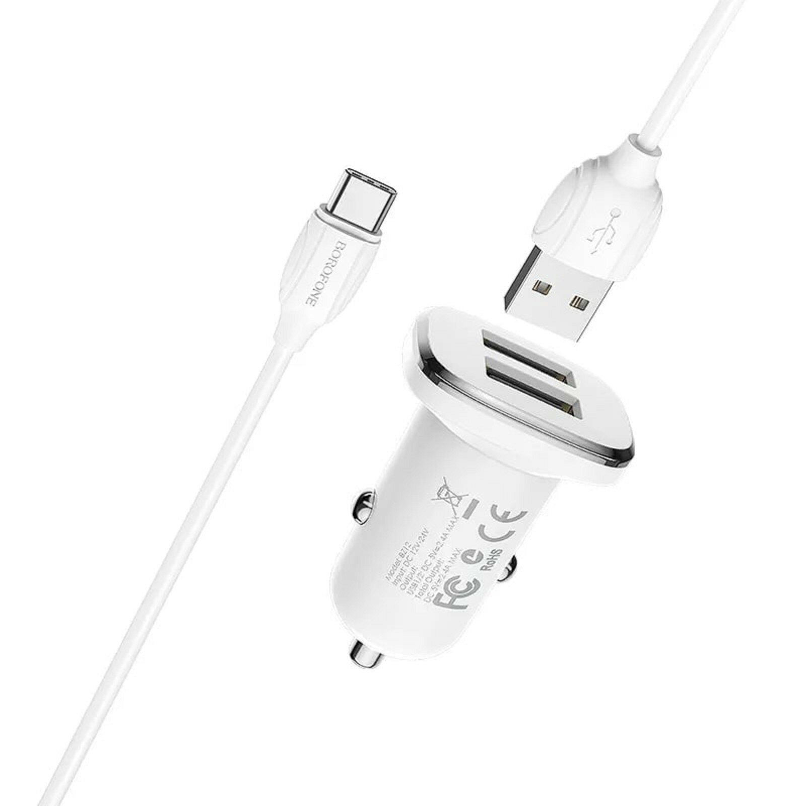 Автомобильное зарядное устройство Borofone BZ12, 2xUSB, 2.4 А, кабель Type-C, белое