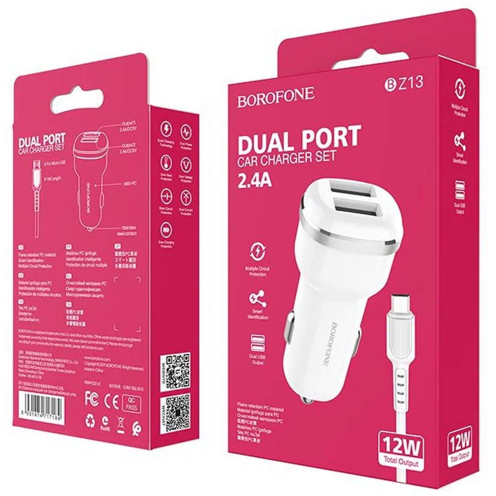 Автомобильное зарядное устройство Borofone BZ13 Extreme Dual Port Car Charger set, с кабелем Micro-USB (ORIGINAL), белый