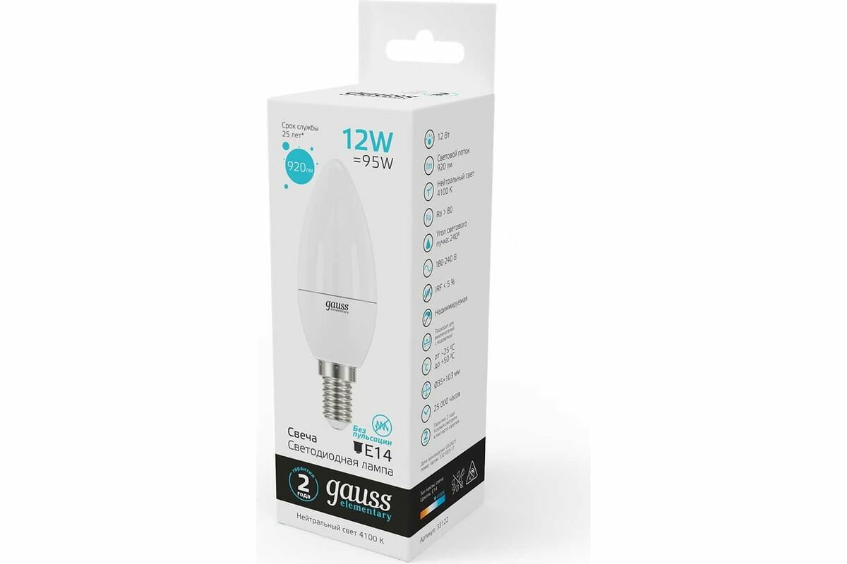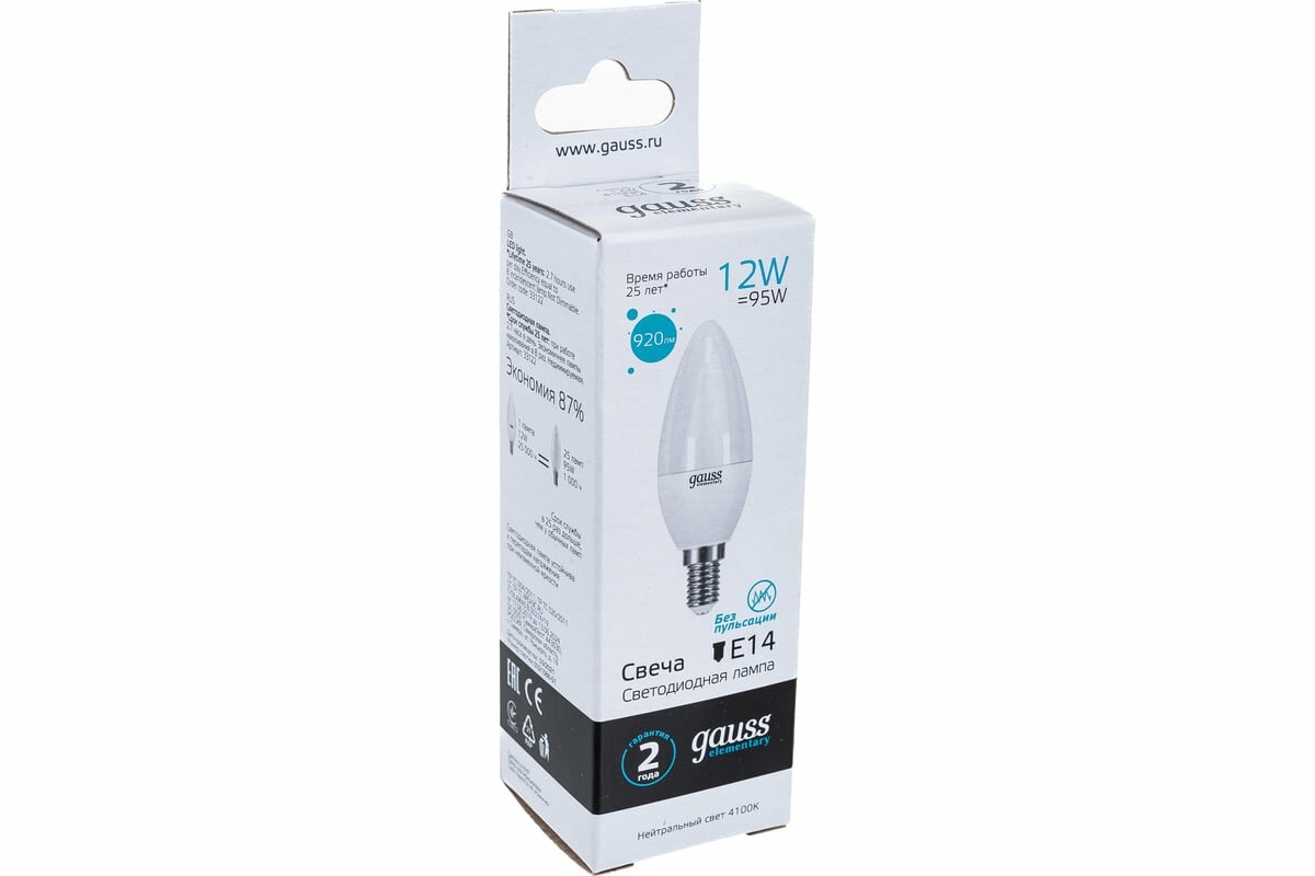 Лампа светодиодная Gauss 12 вт, цоколь е14, свеча, нейтральный белый, 25000 ч, b37-12w-4100-e14