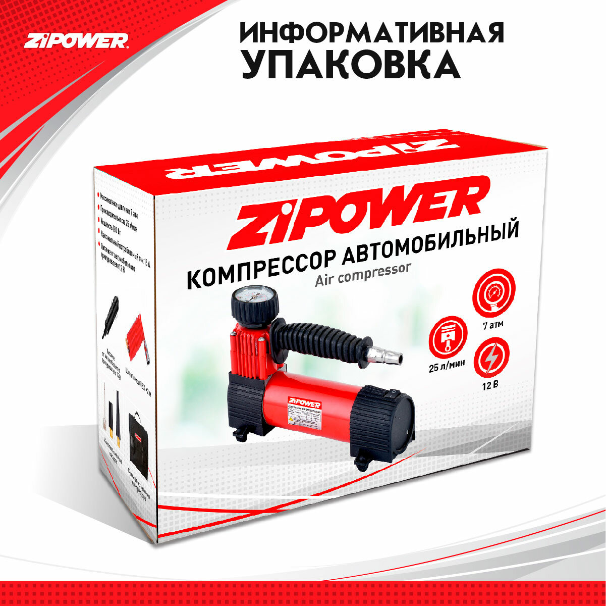 Компрессор автомобильный 12В, 15А,180 Вт, 25л/мин Zipower