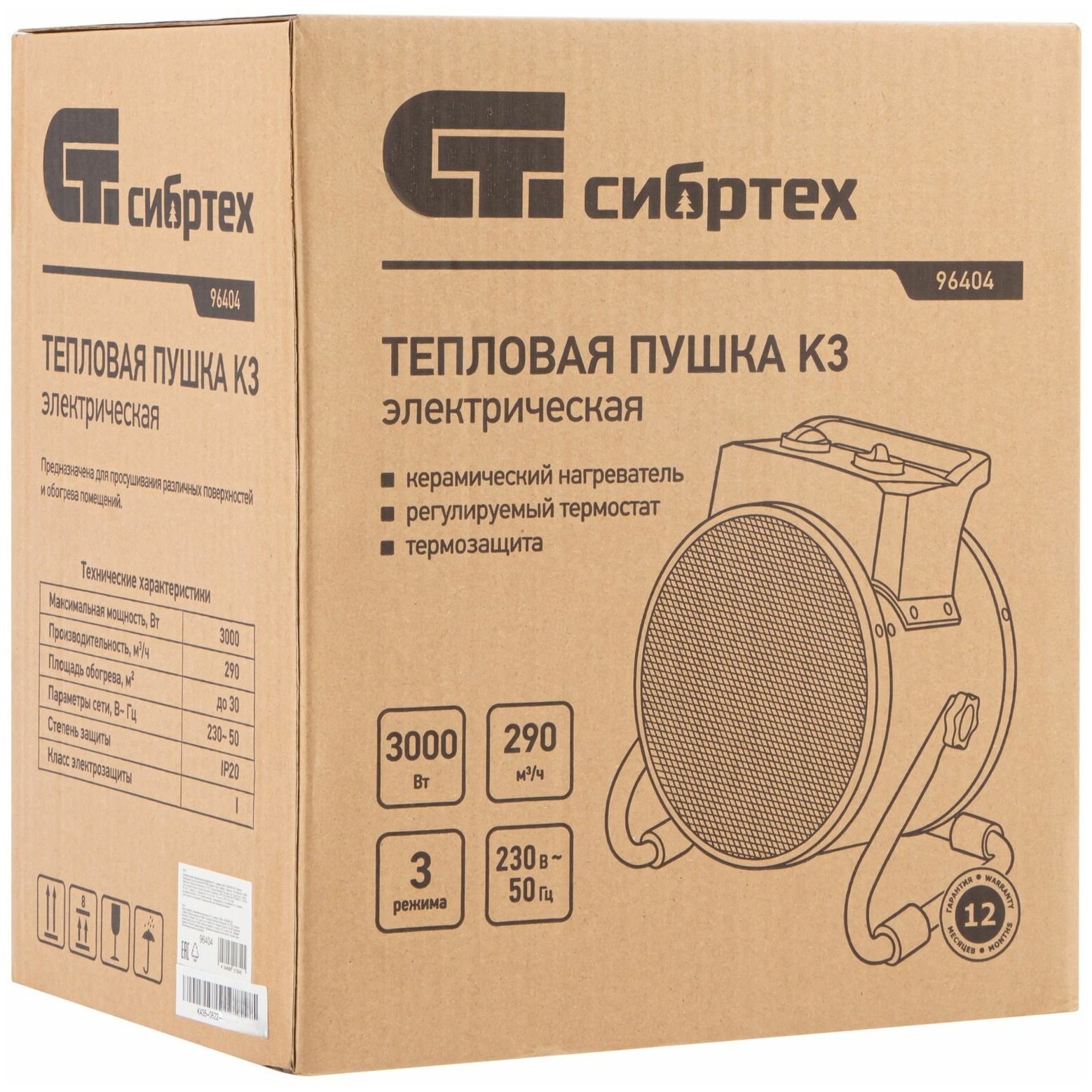 Тепловая пушка, керамический нагреватель K3, 3 режима, 230В, 1500/3000 Вт// Сибртех 96404