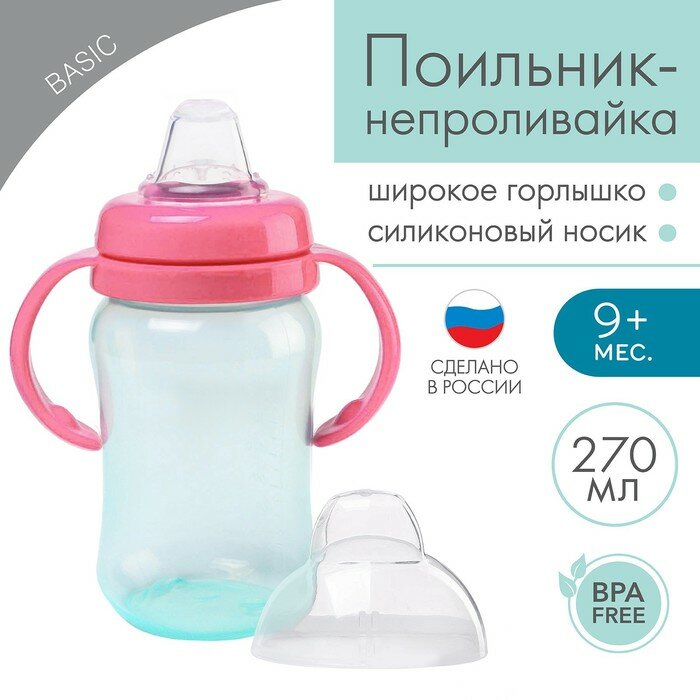 Поильник - непроливайка с силиконовым носиком, 270 мл, бирюзовый/розовый интересное: