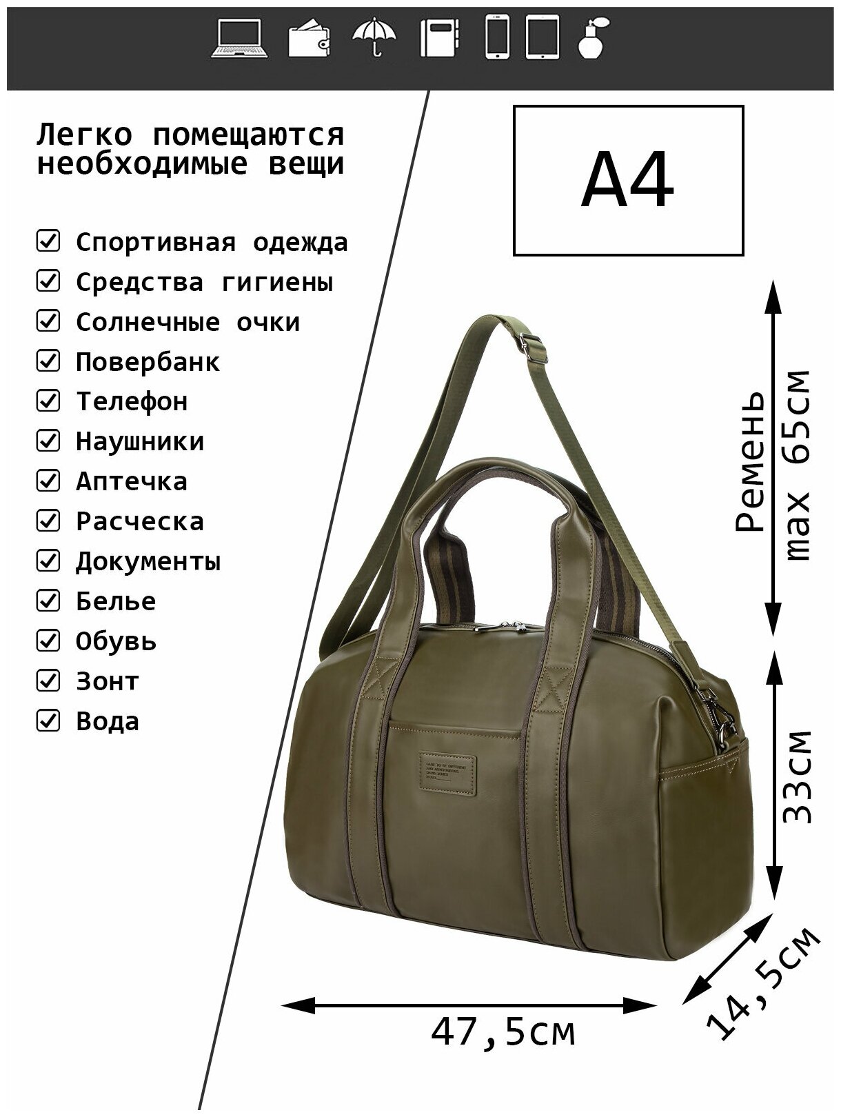 | Особенности модели | вмещает А4 / внешний карман / внутренний карман / плечевой ремень |