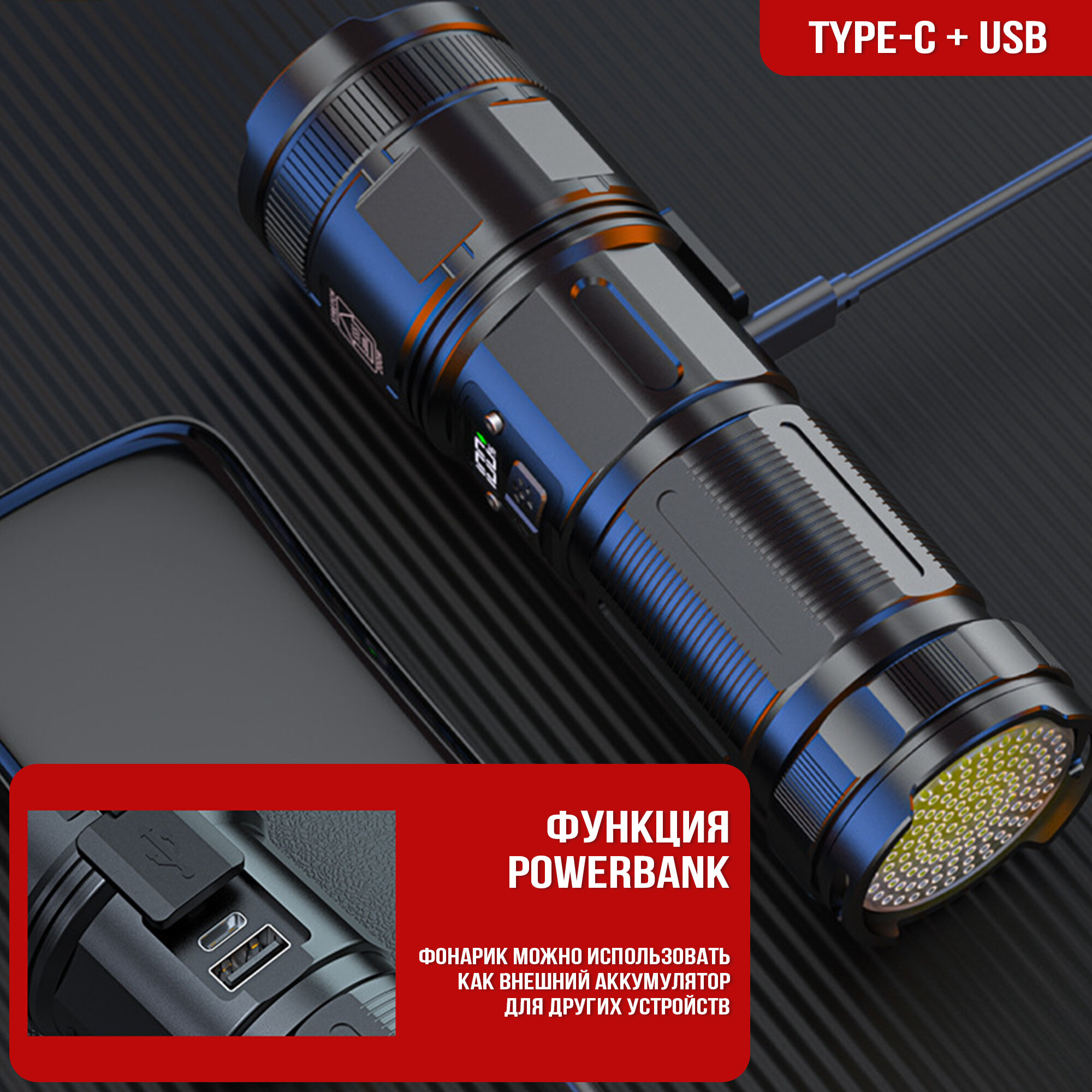 Фонарик светодиодный аккумуляторный ручной премиум-класса / 8 режимов света / режим powerbank / zoom интересное: