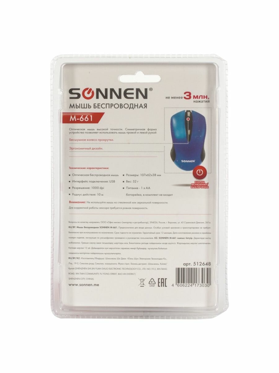 Купить Мышь беспроводная SONNEN M-661Bl, USB, 1000 dpi, 2 кнопки + 1 колесо-кнопка, оптическая, синяя, 512648