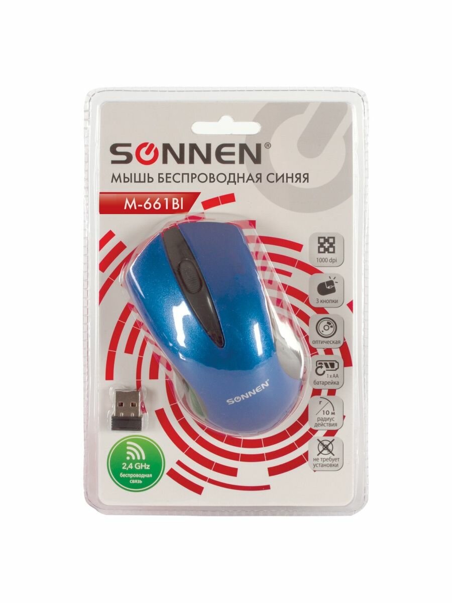 Мышь беспроводная SONNEN M-661Bl, USB, 1000 dpi, 2 кнопки + 1 колесо-кнопка, оптическая, синяя