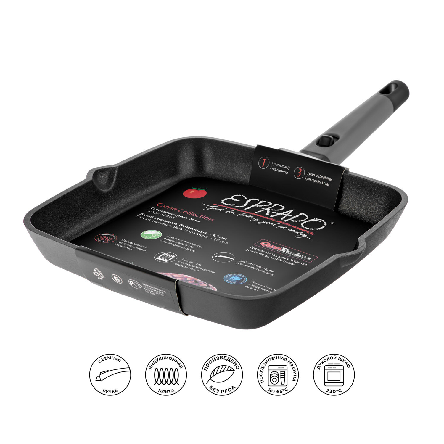 Купить Сковорода-гриль ESPRADO Carne, индукция, 28 см, со съемной ручкой