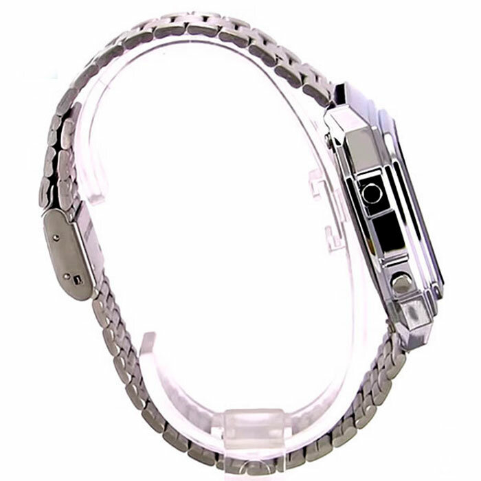 | Плюсы: | Классический вид. Корпус хромированный. Браслет нержавеющий, быстро регулируемый. Крупный дисплей ( почти во весь корпус) с большими цифрами. |