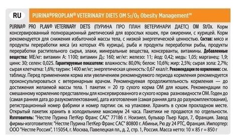 Корм влажный диетический (паучи) Pro Plan Veterinary Diets Cat OM Obesity Management для кошек при ожирении, курица, 85 г х 10 шт интересное: