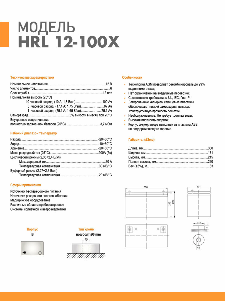 Аккумулятор DELTA HRL 12-100 X (12В, 100Ач / 12V, 100Ah / вывод под болт М6) (UPS серия)