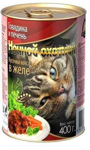Влажный корм для кошек Ночной охотник (говядина, печень в желе), 12 шт по 400 гр