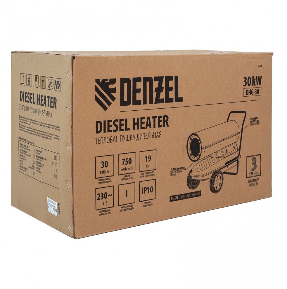 Дизельная тепловая пушка Denzel Dhg-30, 230В, 30000 Вт, 750м3/ч, прямой нагрев Denzel 10284097 .