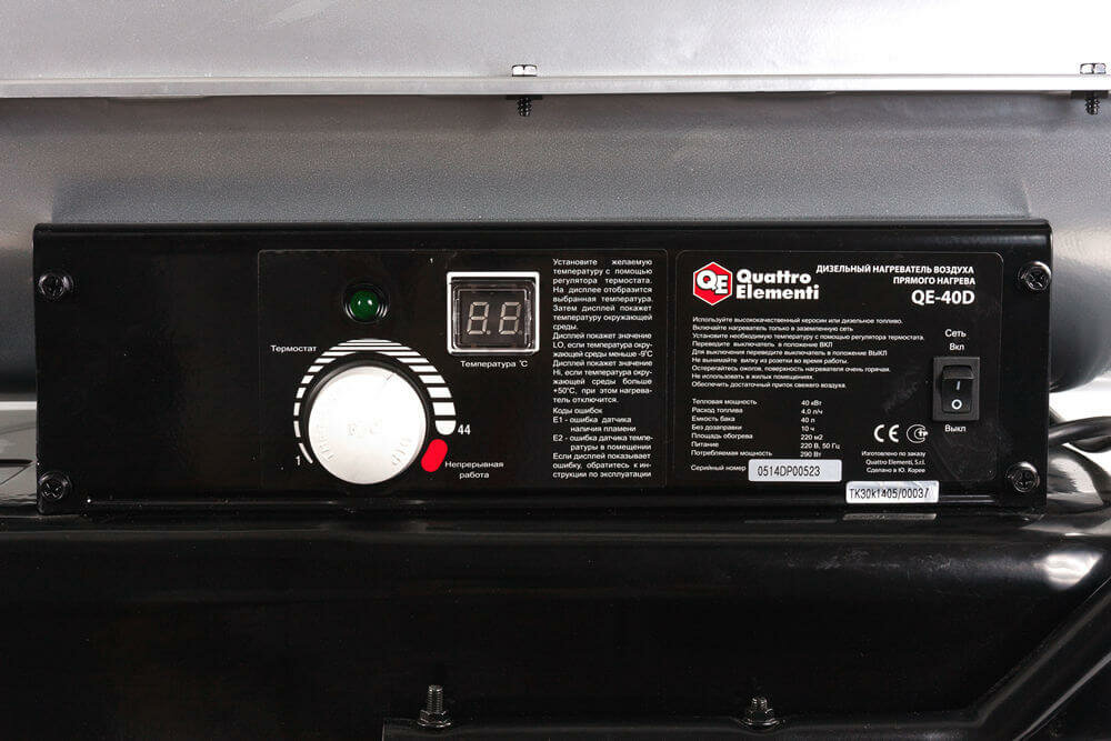Нагреватель воздуха дизельный прямого нагрева QUATTRO ELEMENTI QE- 40D (40кВт, 480м3/ч, расход топлива 4,0кг/ч, бак 40л)