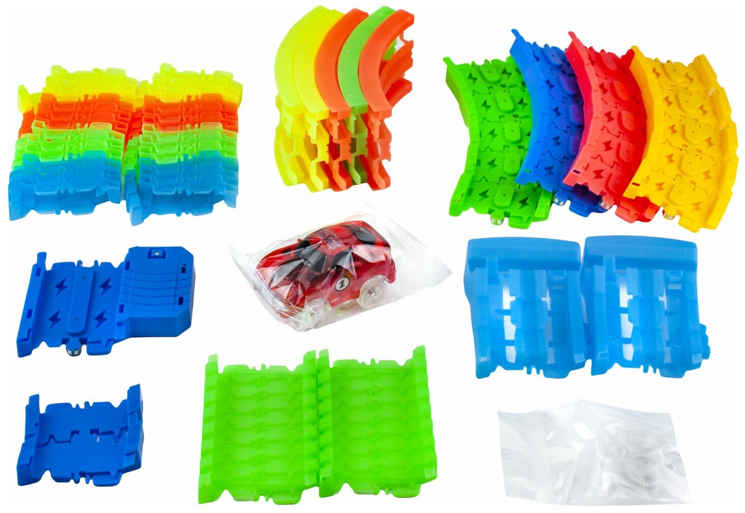 | Комплектация | 21 деталь c LED подсветкой, 48 светящихся в темноте люминесцентных деталей, машинка со специальными захватами, предотвращающими падение с петли с 5 лампами, мертвая петля с люминесцентной подсветкой, блок питания LED трассы |