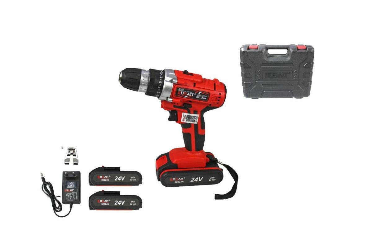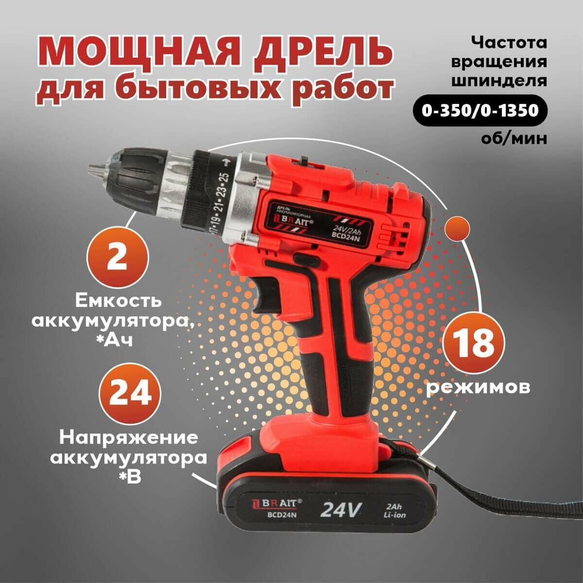 Дрель шуруповерт аккумуляторный BRAIT BCD24N с подсветкой для дома и мастерской (24В, 30нМ, 2хLi-ion АКБ)