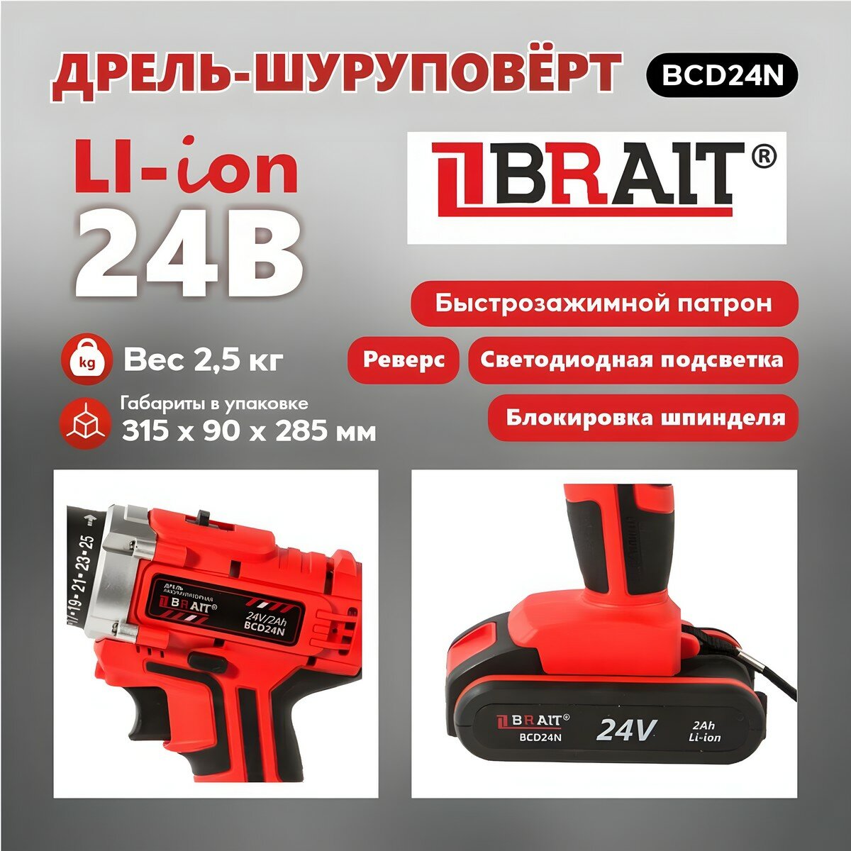 Дрель аккумуляторная BRAIT BCD24N (24В Li-ion;2 акк.2,0Ач,2 ск,30Нм;быстроз.патр;реверс;кейс;подсве)
