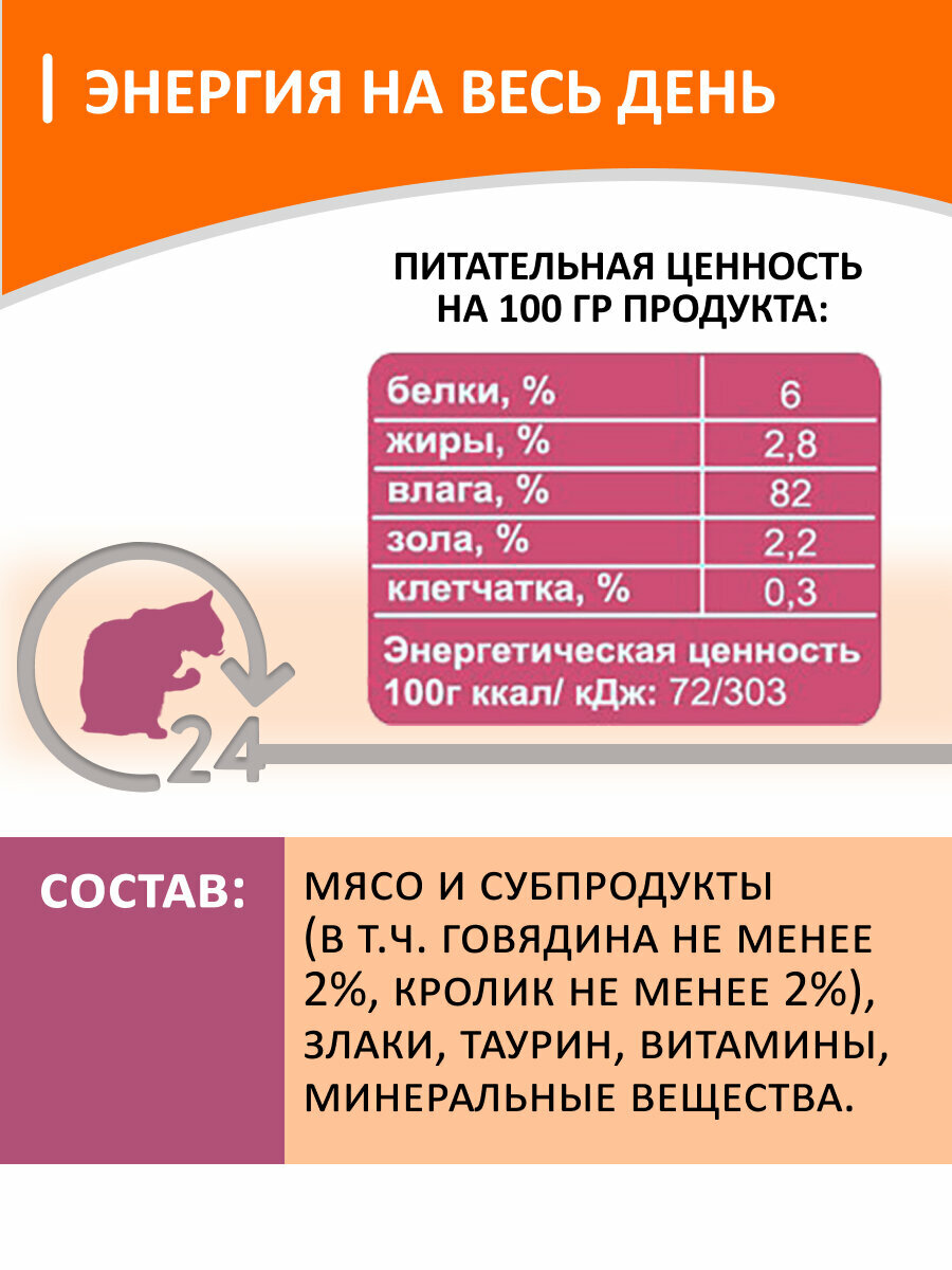 | Состав | мясо и субпродукты (в том числе говядина не менее 2%, кролик не менее 2%), злаки, таурин, витамины и минеральные вещества. |