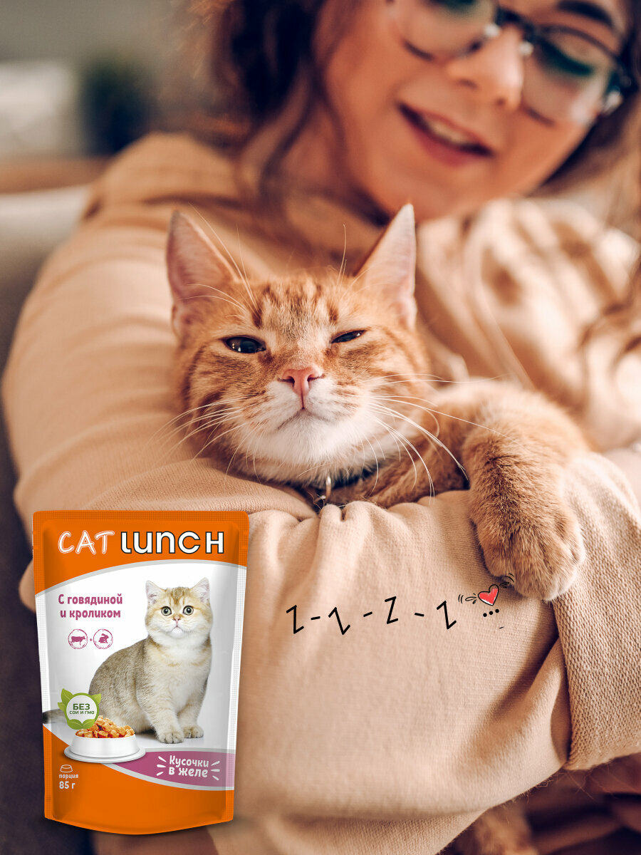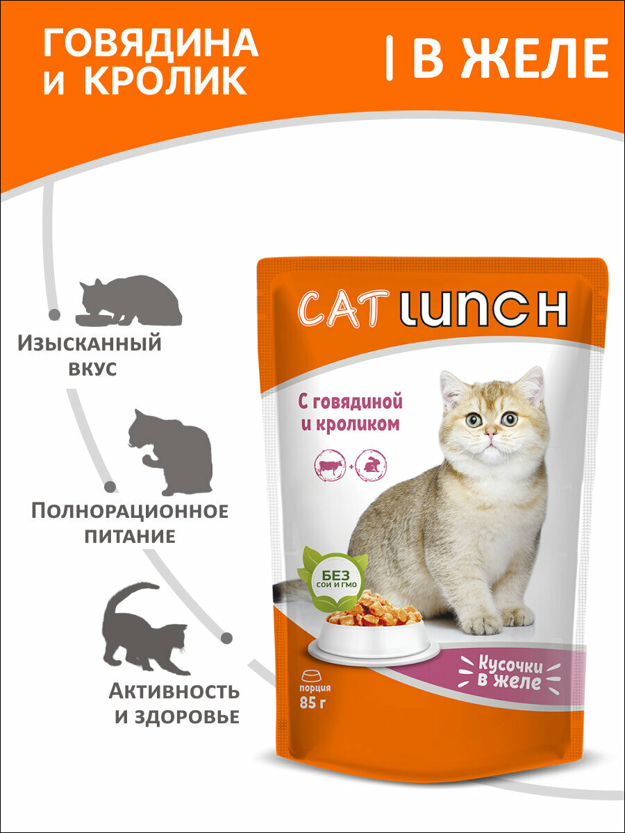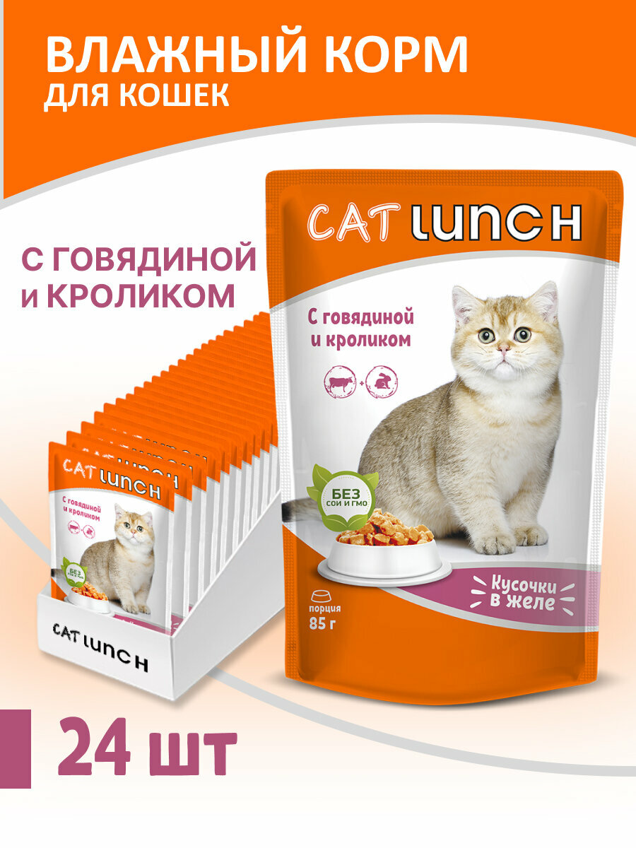 Влажный корм для кошек Cat Lunch кусочки в желе Говядина и Кролик, паучи по 85г (24 шт. в упаковке)