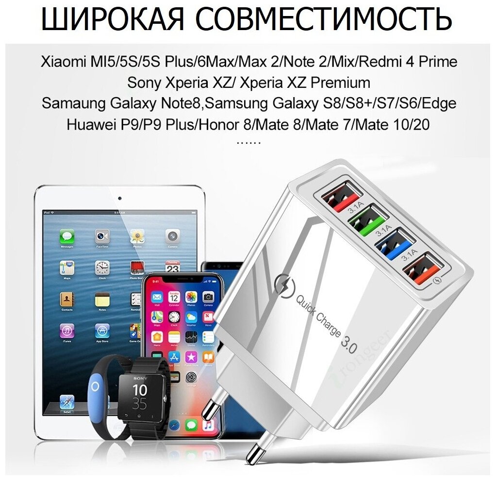Ниже Вы можете прочитать отзывы на Зарядное устройство для телефона на 4 USB / Быстрая зарядка Quick Charge 3.0 / 5V 3.1 А / черная, ознакомится с подробными характеристиками, посмотреть интересные обзоры и фотографии на Зарядное устройство для телефона на 4 USB / Быстрая зарядка Quick Charge 3.0 / 5V 3.1 А / черная.