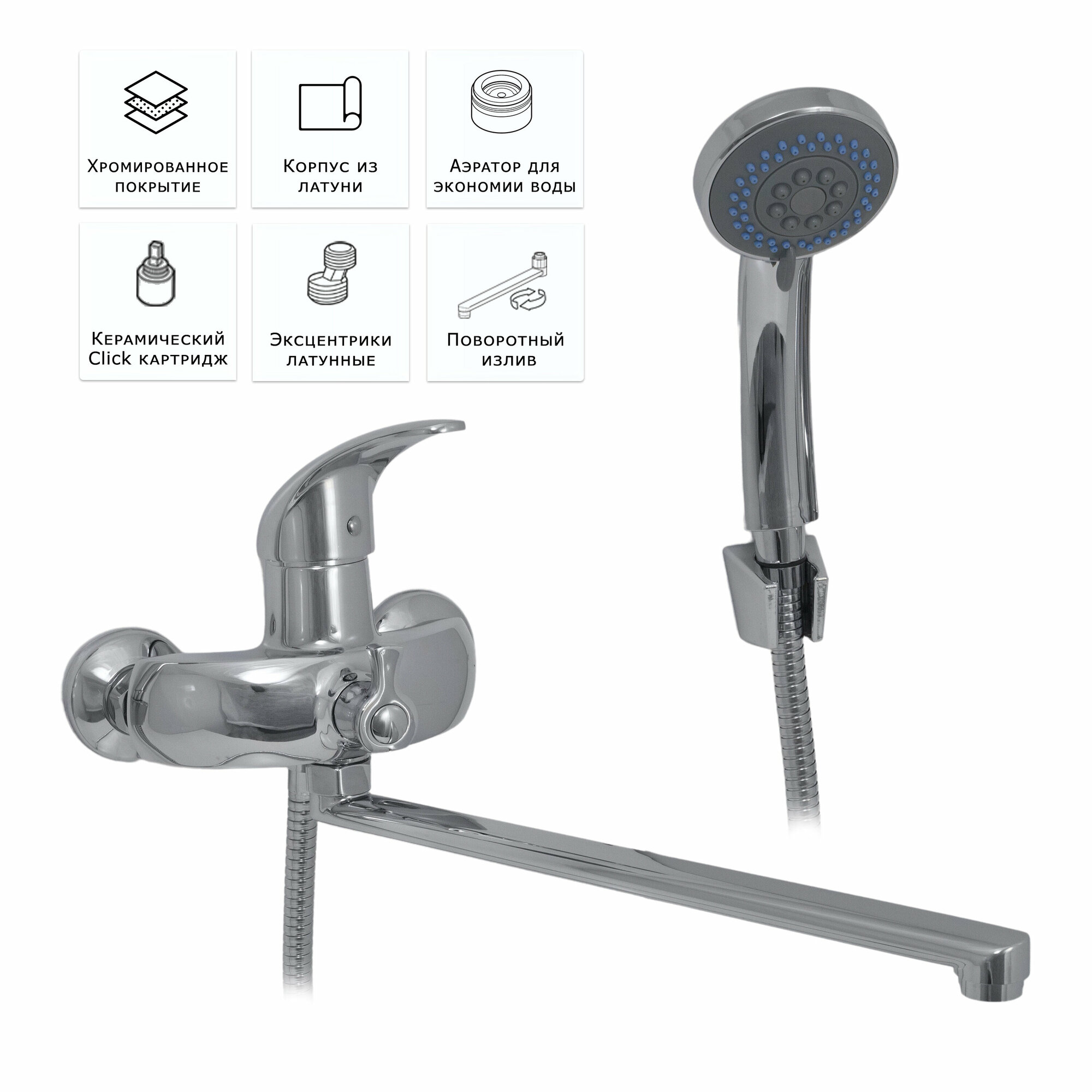 Bach / Смеситель Для ванны Плоский поворотный излив Лейка душевая 2-х функциональная / Код 12968