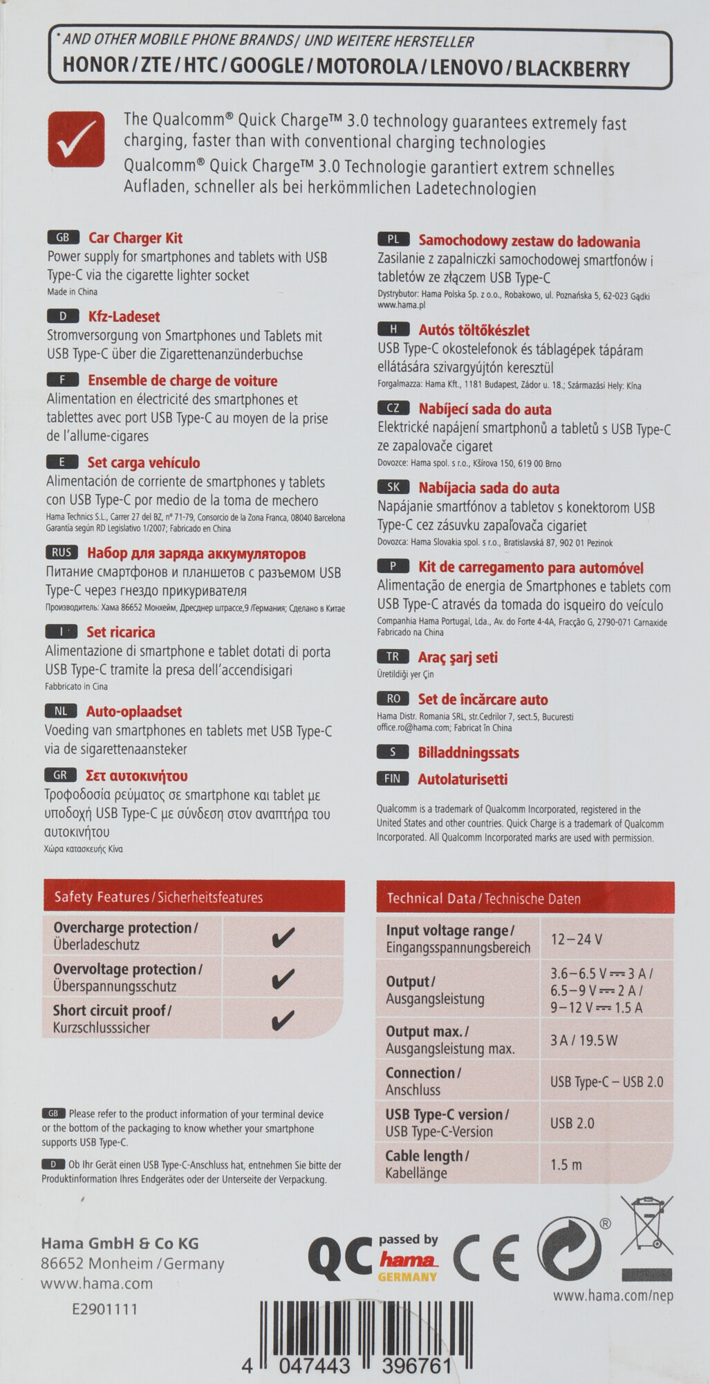 Купить Комплект зарядного устройства HAMA H-183231, USB, USB type-C, 3A, черный [00183231]