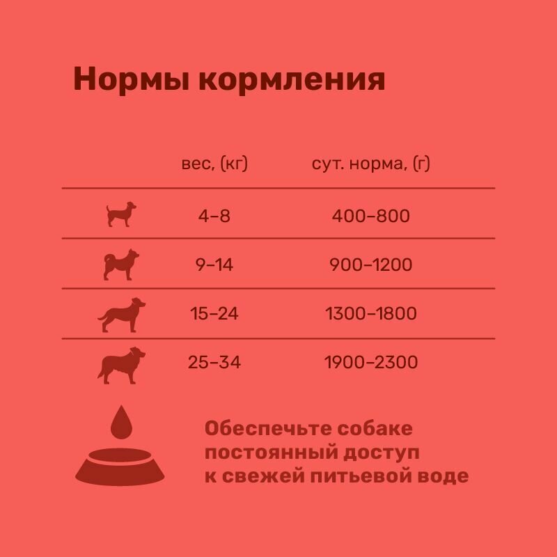 | Дозировка | - вес собаки 4-8 кг - 400-800 г - вес собаки 9-14 кг - 900-1200 г - вес собаки 15-24 кг - 1300-1800 г - вес собаки 25-34 кг - 1900-2300 г |