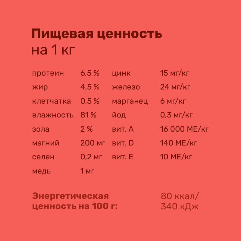 | Пищевая ценность | белок 6.5%, жир 4.5%, клетчатка 0.5%, зола 2%, влага 81% |