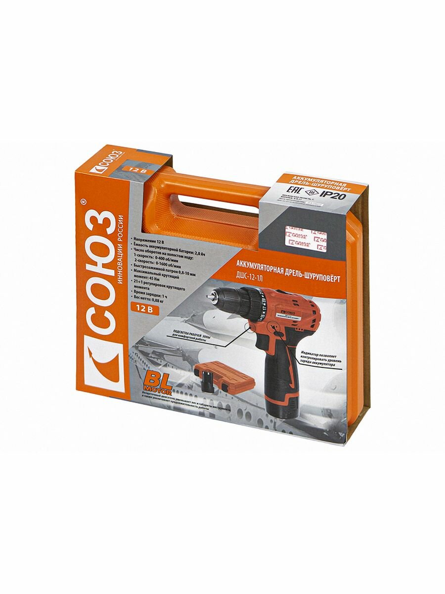 ДШС-12-1Л Дрель аккумуляторная бесщеточная Союз, 12 В, 2 акк, 2,0 Ач, кейс