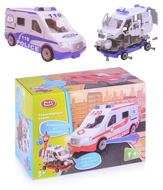 Конструктор - машина "Полиция фургон", винтовой конструктор машинка, инерция, свет + свет, полицейская машинка (собирайка), Play smart 1369