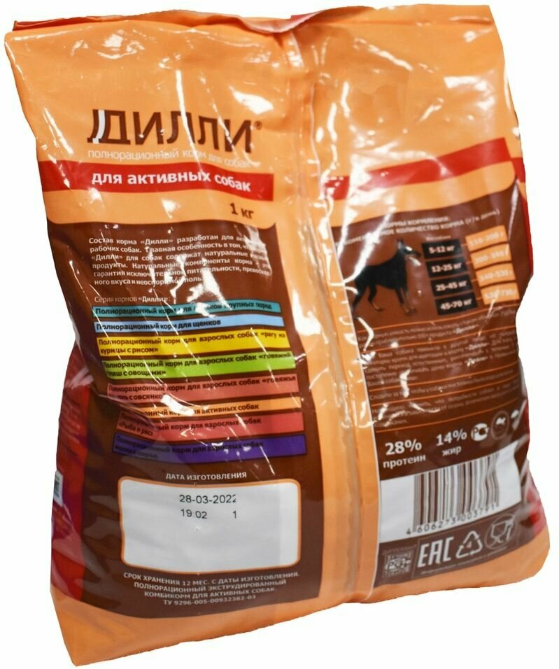Купить Сухой корм для активных собак, полнорационный с курицей и индейкой, Дилли, упаковка 2 шт х 1 кг