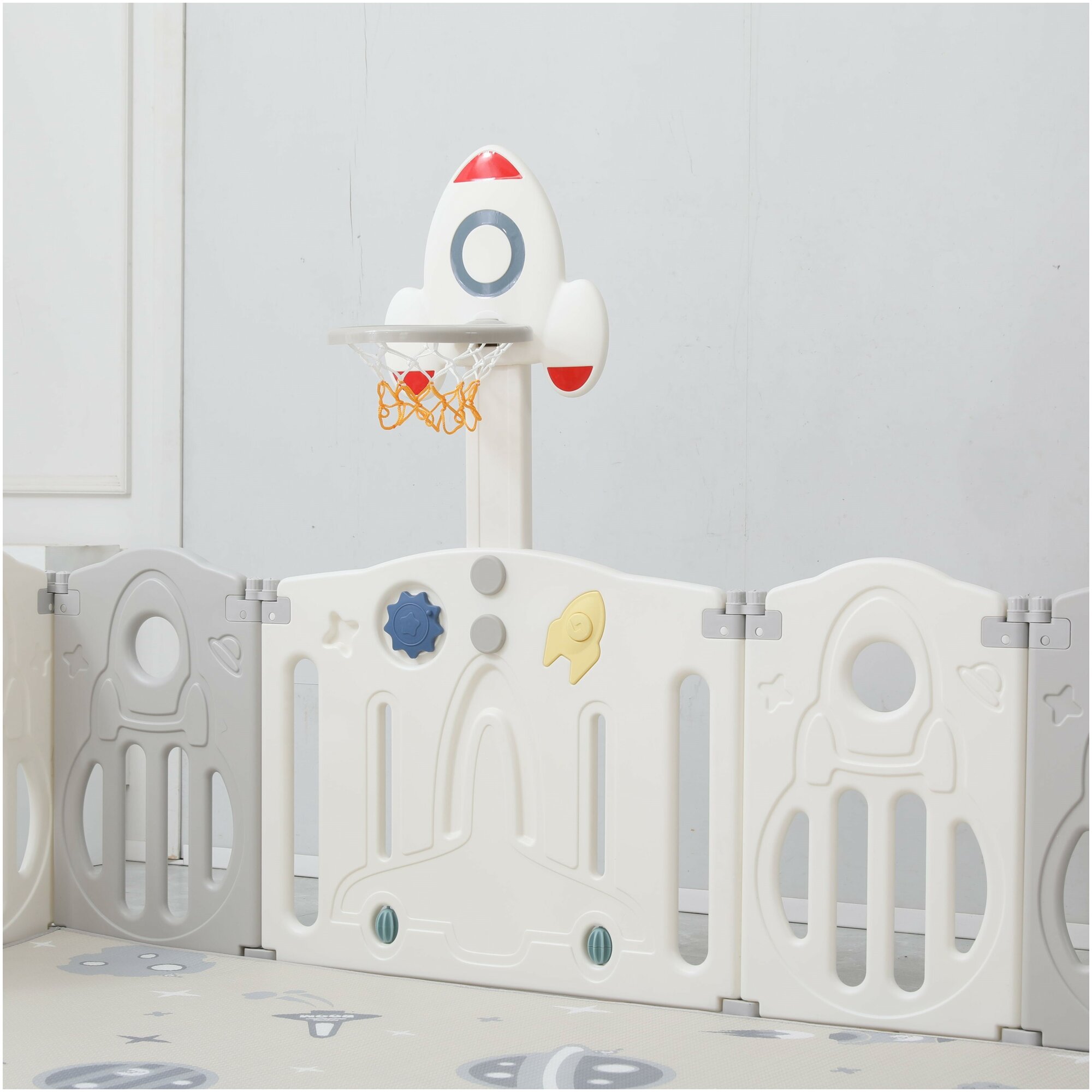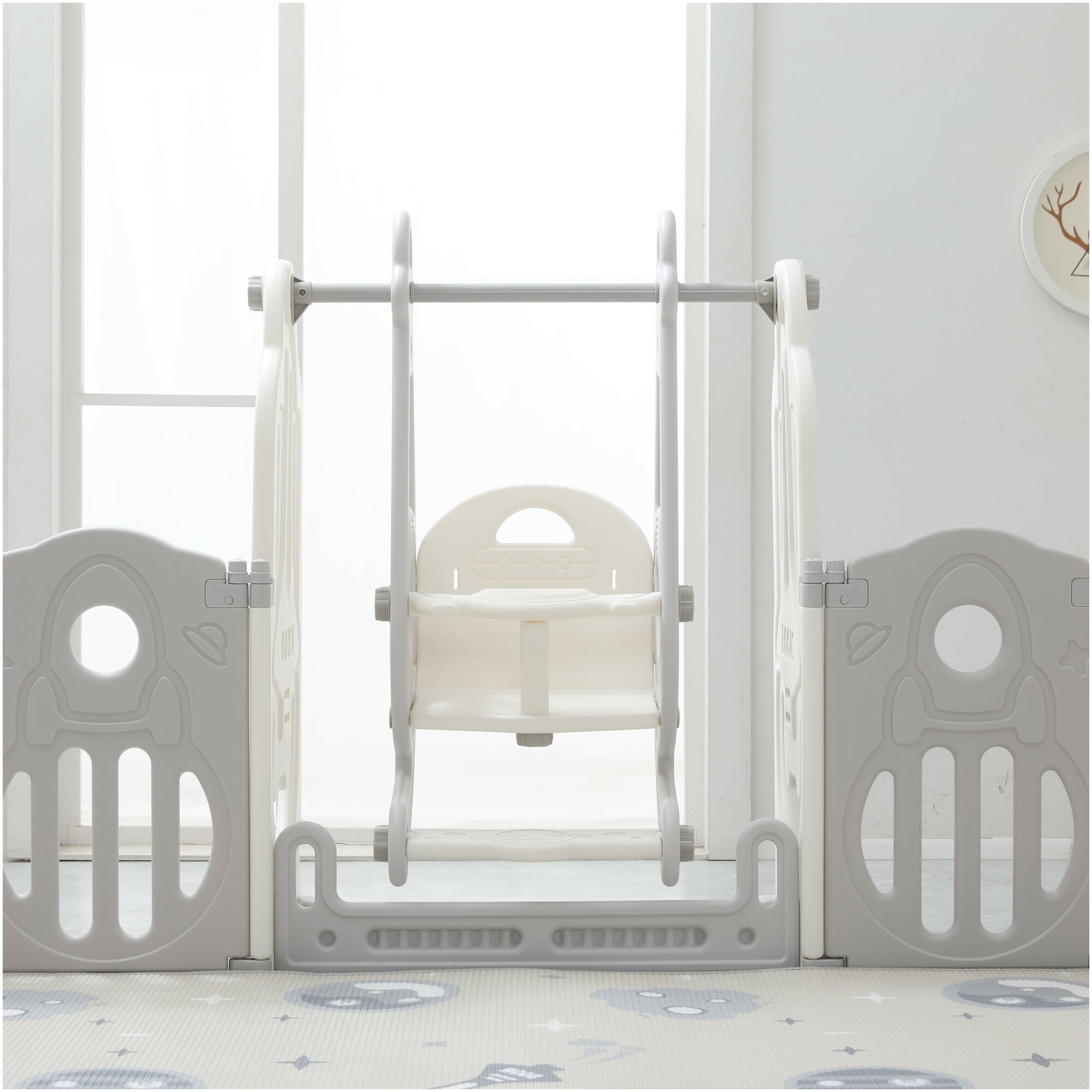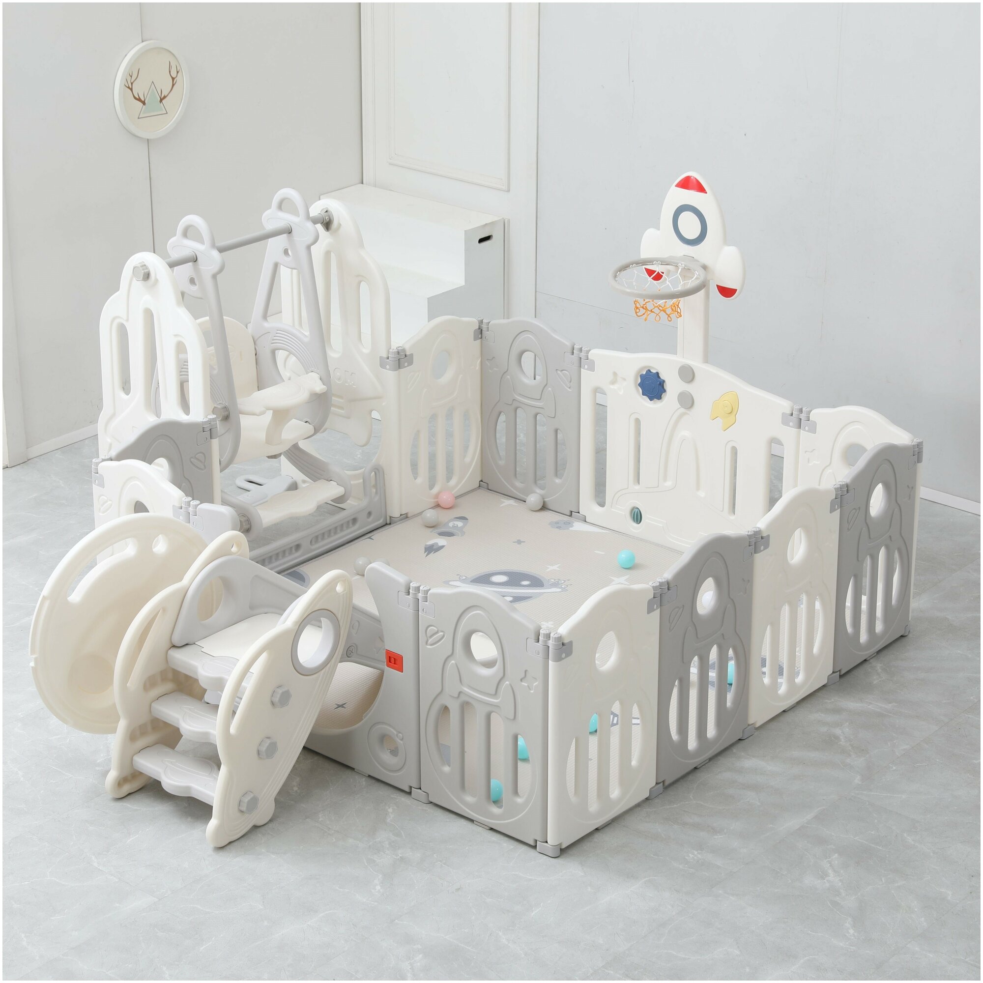 Манеж UNIX Kids "SUPREME Space" Grey, серый, 200x240 см, с качелями, ковриком, горкой и баскетбольным кольцом для дома, улицы