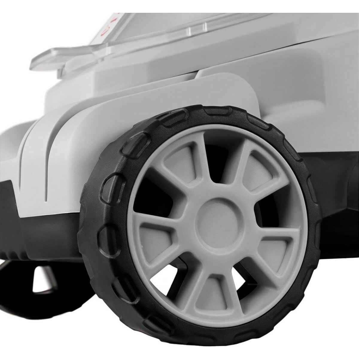 -Плохо забрасывает траву в корзину. -Оборотов меньше, чем у проводной. -Каждое колесо необходимо регулировать по высоте отдельно. |