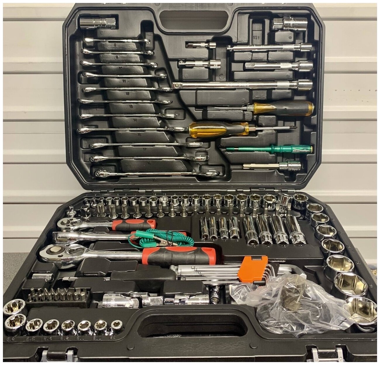 | Дополнительная информация | Трещетка 3 шт., торцевые головки длинные 8-17 мм. 8 шт., головки Торцевые 4-32 мм. 28 шт., головки Е-стандарт 8 шт., головки свечные 16, 21 мм 2 шт., головка-бита T52 1 шт., головки со вставкой torx 3/8 17 шт., ключи комбинированный 8-19 мм. 11 шт., ключи шестигранные 1,5-10 мм. 9 шт., биты под отвертку и трещотку 18 шт., удлинители для трещотки 5 шт., ударные отвертки 2 шт., кардан 3 шт., отвертка под биты 1 шт., переходник отвертки под биты 1/4 1 шт., индикатор напряжения 1 шт., съёмник масляного фильтра 1 шт., адаптер 3/8х1/2 3/8х1/4 2шт. |