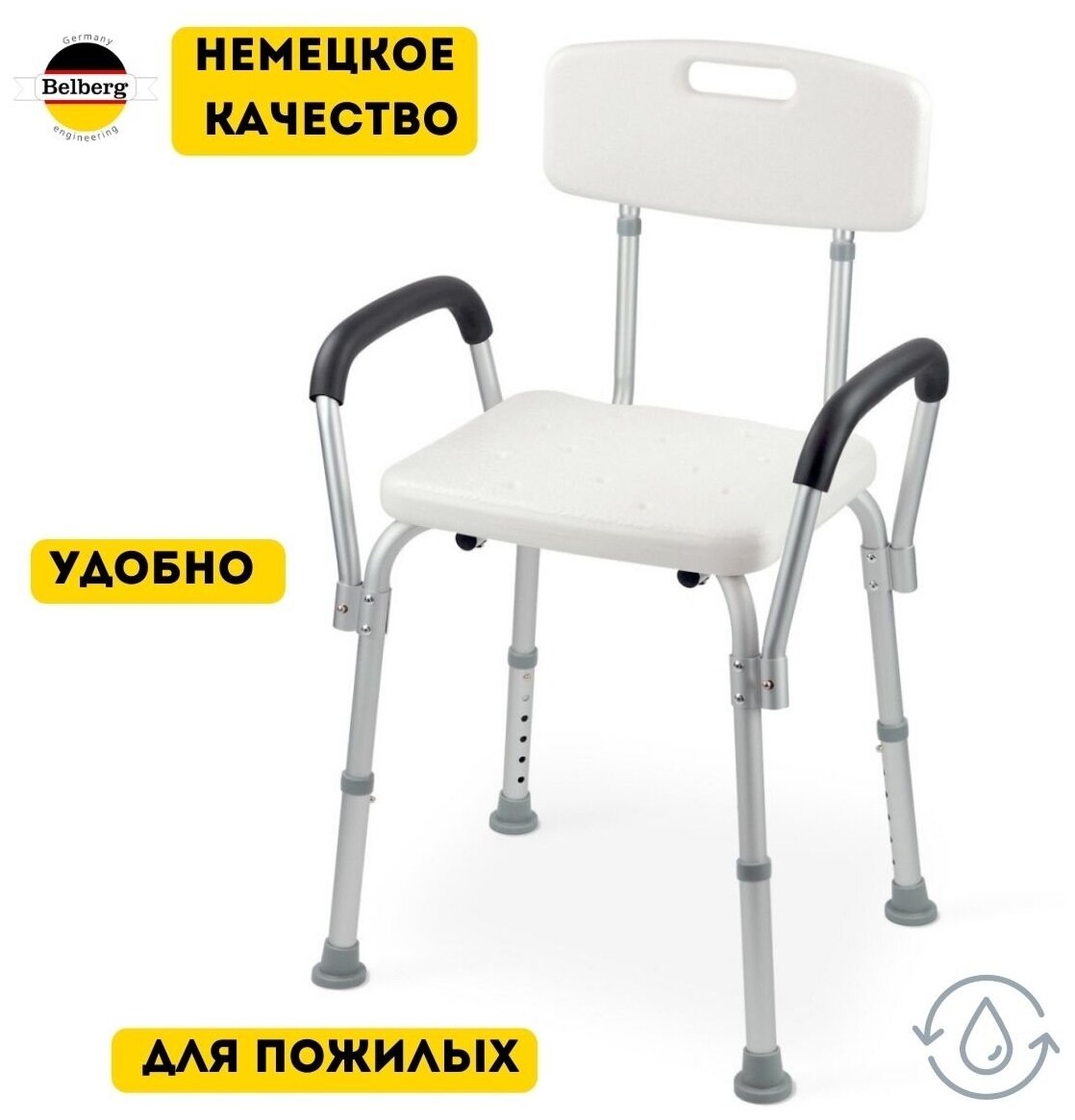 Стул для ванной комнаты Belberg BB-13 со спинкой и съемными ручками, ширина 40 см, нагрузка до 125 кг, регулировка высоты / для пожилых людей и инвалидов