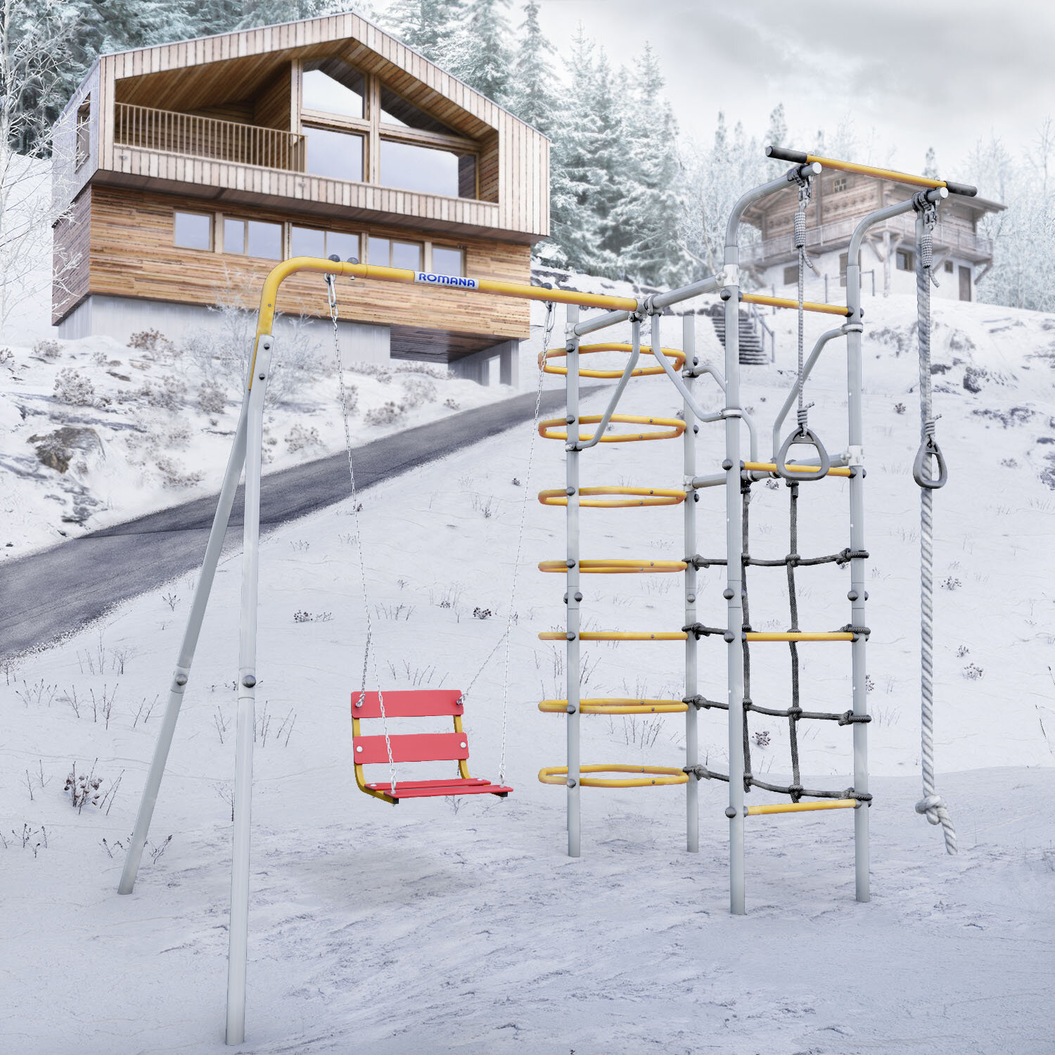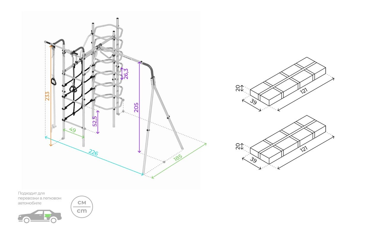 | В комплекте | веревочная лестница, гимнастические кольца, канат, качели, лестница, сетка для лазания, турник |
